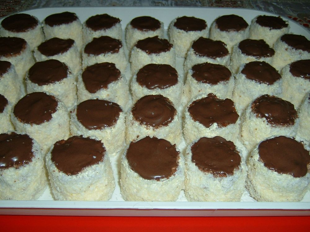 Amikor a tészta kihűlt, pogácsaszaggatóval kiszaggatjuk, kettévágjuk a korongokat, megkenjük a krémmel, összeragasztjuk, körben is bekenjük, majd kókuszreszelékbe forgatjuk. A tetejére csokimázat tehetünk.