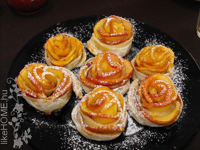 250 grammos kiszerelésű, kész, lapra nyújtott leveles tésztákkal dolgoztam. A tésztát 6 egyforma, 2,5 cm széles csíkra vágjuk egy derelyevágóval. Majd megszórjuk cukorral az összes csíkot, ráfektetjük az almákat egymás mellé, kissé meghintjük fahéjjal, majd feltekerjük. A végét kicsit odanyomjuk, hogy rátapadjon.